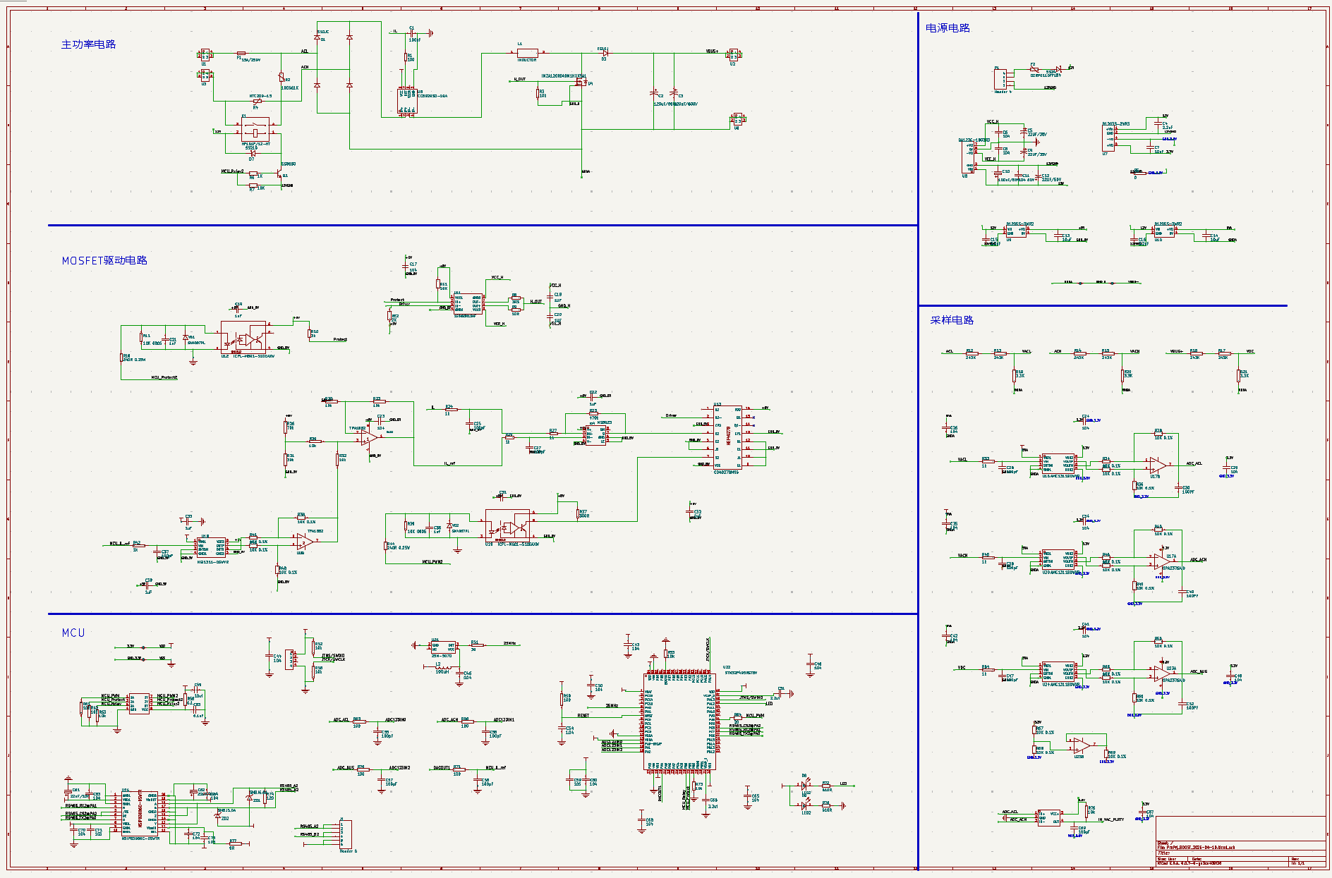 整个电路分为主功率电路,MOSFET驱动电路,辅助电源,采样电路,MCU控制电路5个部分。