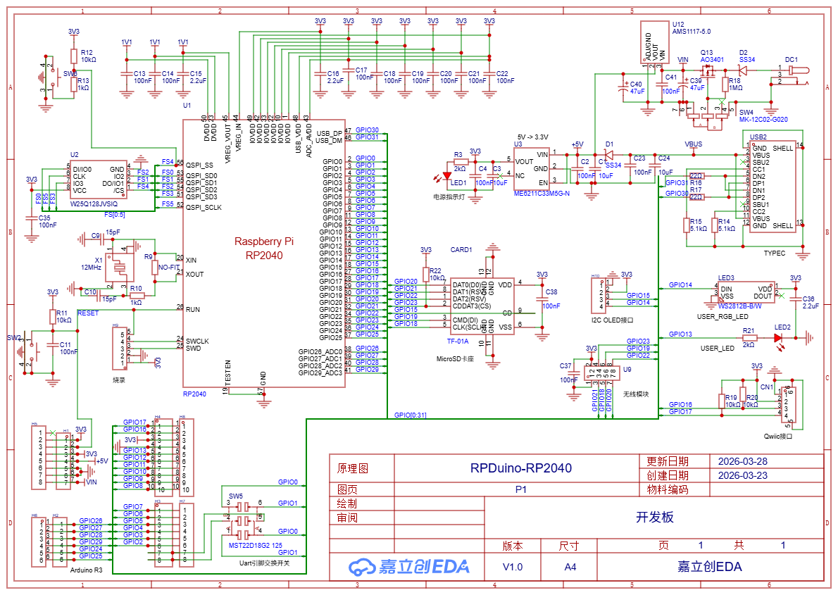 根据任务要求本次我选用的是 RP2040 芯片设计了一款MCU核心板,此板卡主要用于开发学习套件的主控,常用于实时信号采集与处理场景,完全兼容 Arduino Uno R3 接口规范的开发板,以及电源供电管脚。