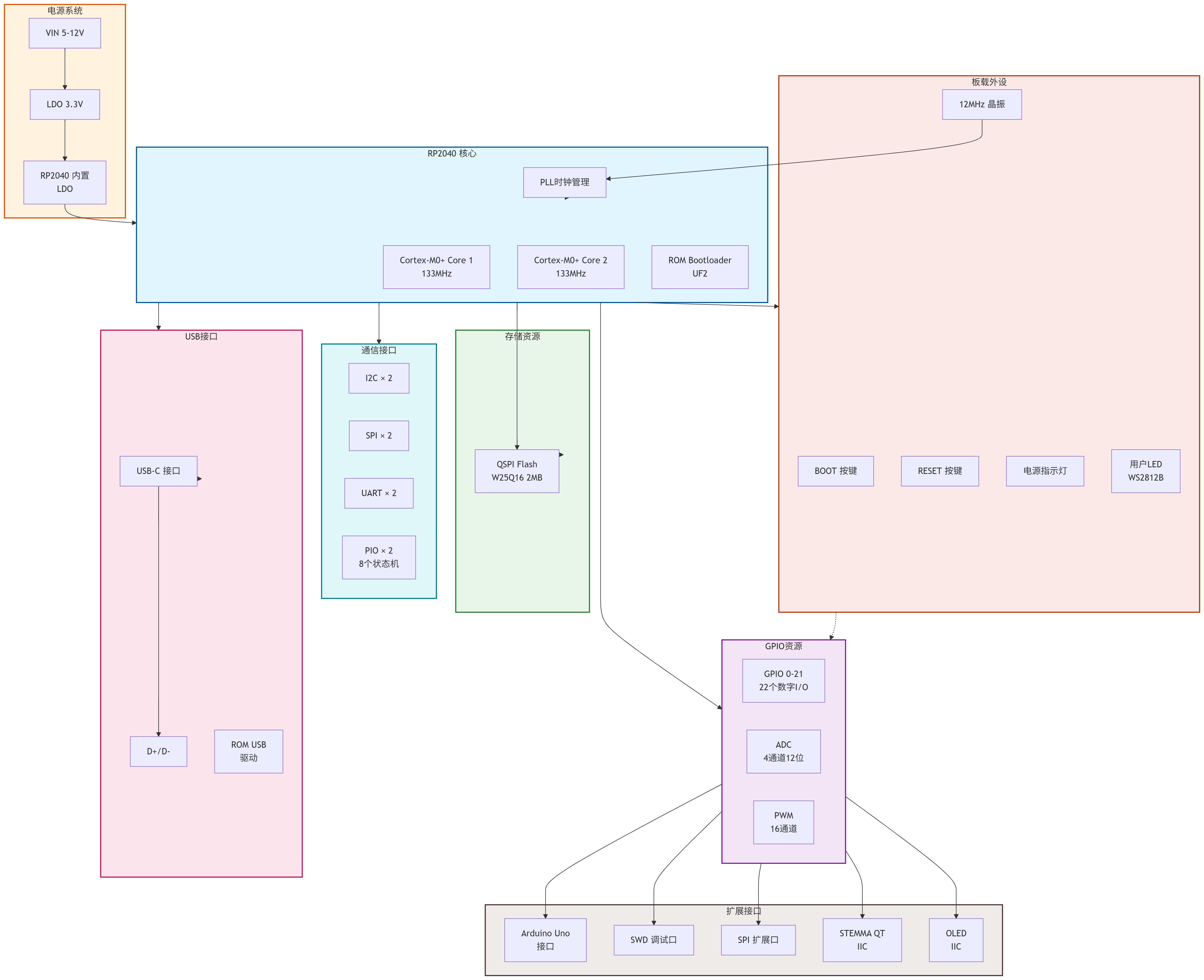 - 主控芯片:采用RP2040(Cortex-M0内核,最高133MHz主频)。