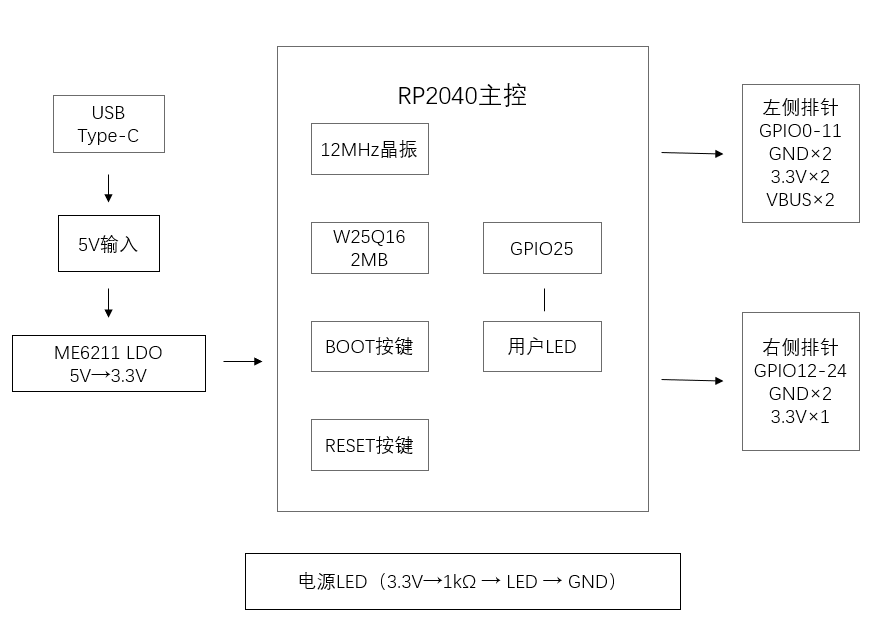 围绕RP2040微控制器进行构建,板上资源框图如下
