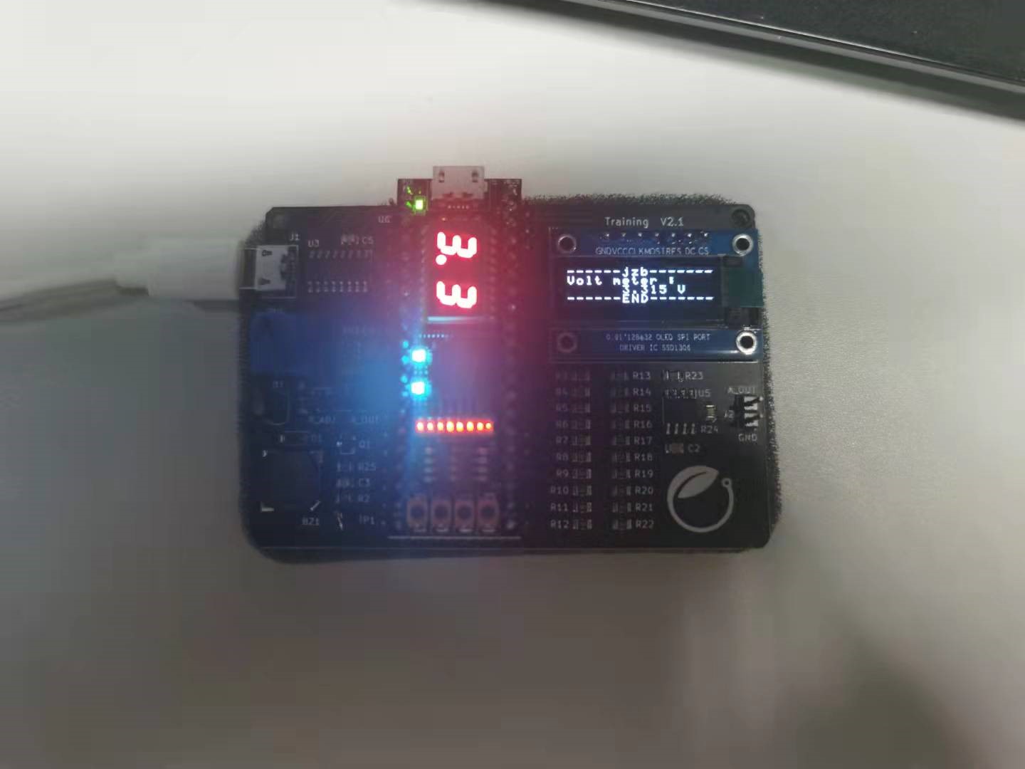 结论:实现了旋转电位计产生0-3.3V的电压后利用板上的串行ADC对电压进行转换,将电压值在板上的OLED屏幕上显示出来,并可以实现电压小数点后三位的显示。在电压调节的过程中会出现数据的抖动,在调节完后数值稳定。