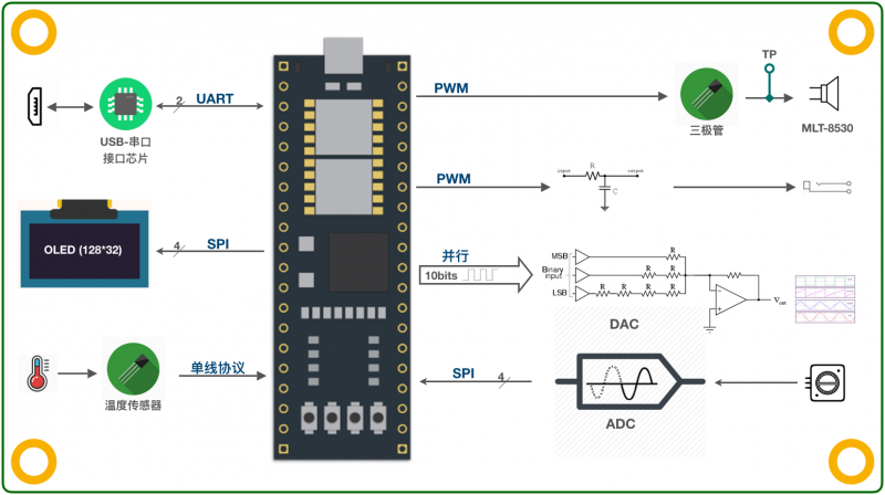 板上采用了一块128*32分辨率的OLED作为信息显示终端,可以显示温度传感器的温度值、通过ADC采集到的电位计的电压值、DDS信号发生器生成的波形以及必要的菜单信息等;通过这个功能可以掌握SPI显示屏的使用、SPI总线逻辑以及屏上信息的文本、图形化显示等。越来越多的电子产品、创意设计都采用图形化的OLED显示屏成为信息展示的终端,无论用MCU还是FPGA的系统,在电赛中的很多项目中也会用到信息的图形化显示。