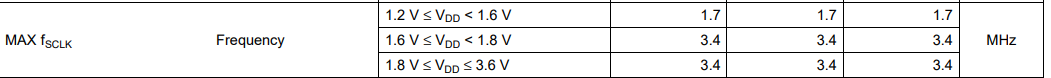 在芯片手册18页,TI已经为我们贴心的算好了时钟最大频率,供电电压3.3V情况下最大频率为3.4MHz(多出来的那些3.4MHz是其他芯片型号的)。