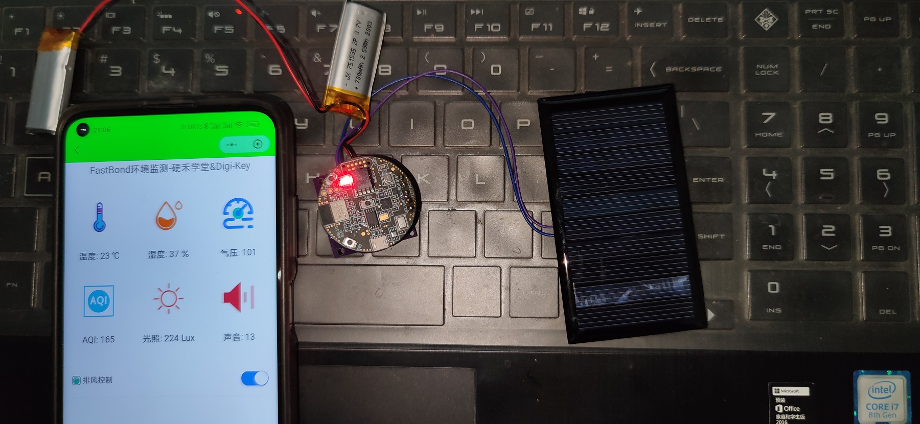 本项目是为参加FastBond活动设计的,活动要求项目中必须同时使用ADI和美信的产品。本项目设计了基于微信小程序蓝牙通信的室内环境监测仪,系统使用RSL10开发板实现了采集环境数据:温度、湿度、气压、光照、声音、空气质量指数,通过低功耗蓝牙将采集数据传输到智能手机微信小程序,设计了微信小程序数据展示UI界面。电源系统采用了美信和亚德诺两家的产品,其中美信公司的MAX1551EZK实现太阳能锂电池充电管理,ADI公司的ADP150AUJZ-3.3实现锂电池3.7V~4.2V转3.3V给控制芯片和传感器芯片供电。