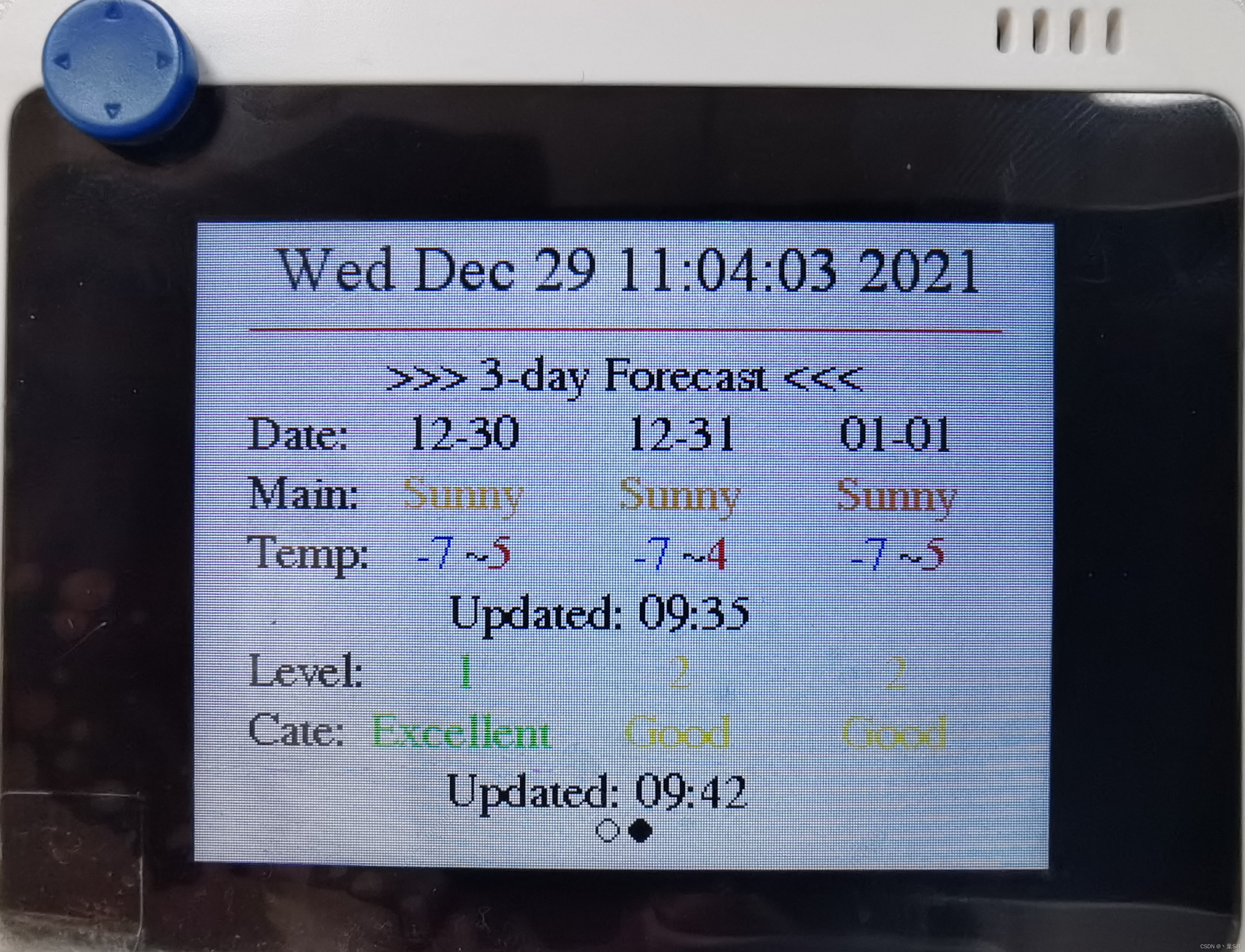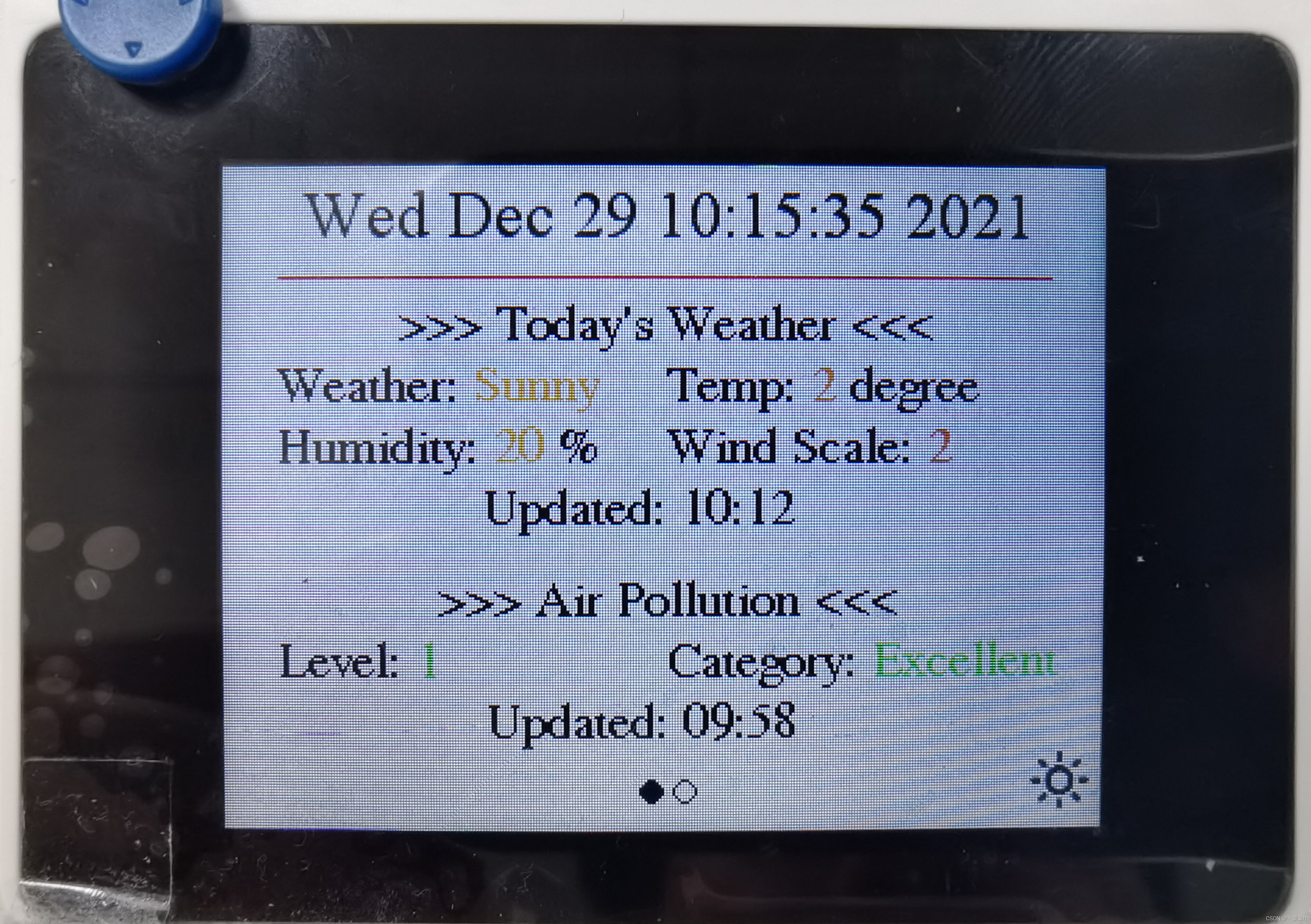 LCD显示效果的设计较为自由,按照上述链接设计的效果都比笔者的好看。此外,由于设计的页面无法一次性显示当天+三天预报,因此设置一个假页面切换功能(实际就是页面刷新显示不同内容),通过五向开关左右按键实现。其效果如图所示,右下角为天气图标,空气质量的颜色与等级对应。