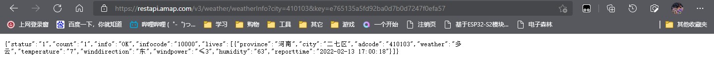 申请一个key后就可以进行天气信息查询,高德开放平台给出了有服务示例,我们将所要查询的地区的区域代码以及key替换后,再把这行网址输入网页地址栏中按下回车,就可以得到所在地区的天气信息,如下图所示: