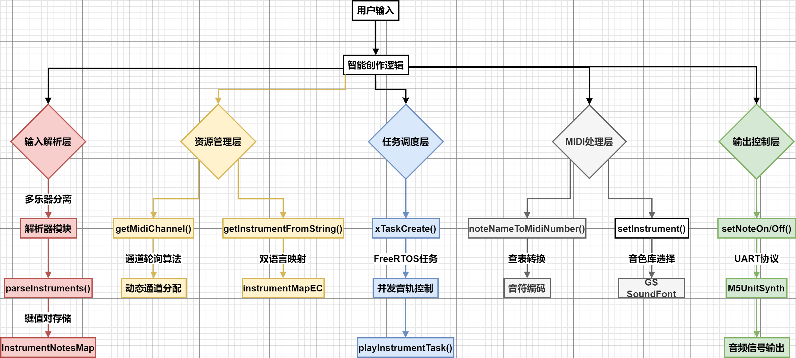 该项目实现了一个基于ESP32-S3主控的多音轨MIDI音乐合成系统,能够解析结构化乐谱输入(如"乐器:音符-力度-时长"格式),通过动态分配16个MIDI通道实现多乐器并行播放,利用FreeRTOS为每个乐器创建独立任务,通过UART2以31250bps标准MIDI协议向合成器发送NoteOn/NoteOff指令控制音符触发与关闭,支持128种GM标准音色库调用及混响、合唱、均衡器等音效调节,形成从乐谱解析、多通道MIDI指令生成、音频合成到物理输出的完整音乐创作链路,同时提供音量、声像、弯音轮等实时控制接口,具备电子乐器核心功能与扩展能力。借助小智智能聊天系统的llm能力来理解midi的乐理,实现音乐的自主创造,剩下的只有大胆地提出你的需求。
