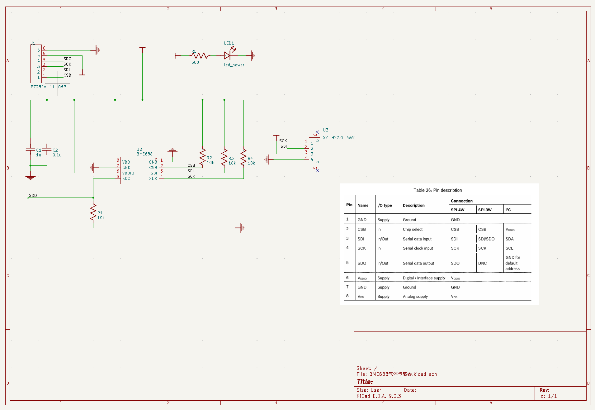 - I2C/SPI选择: BME688的CSB(片选)引脚用于选择通信模式。当CSB接高电平(通过R1上拉)时,传感器工作在I2C模式。