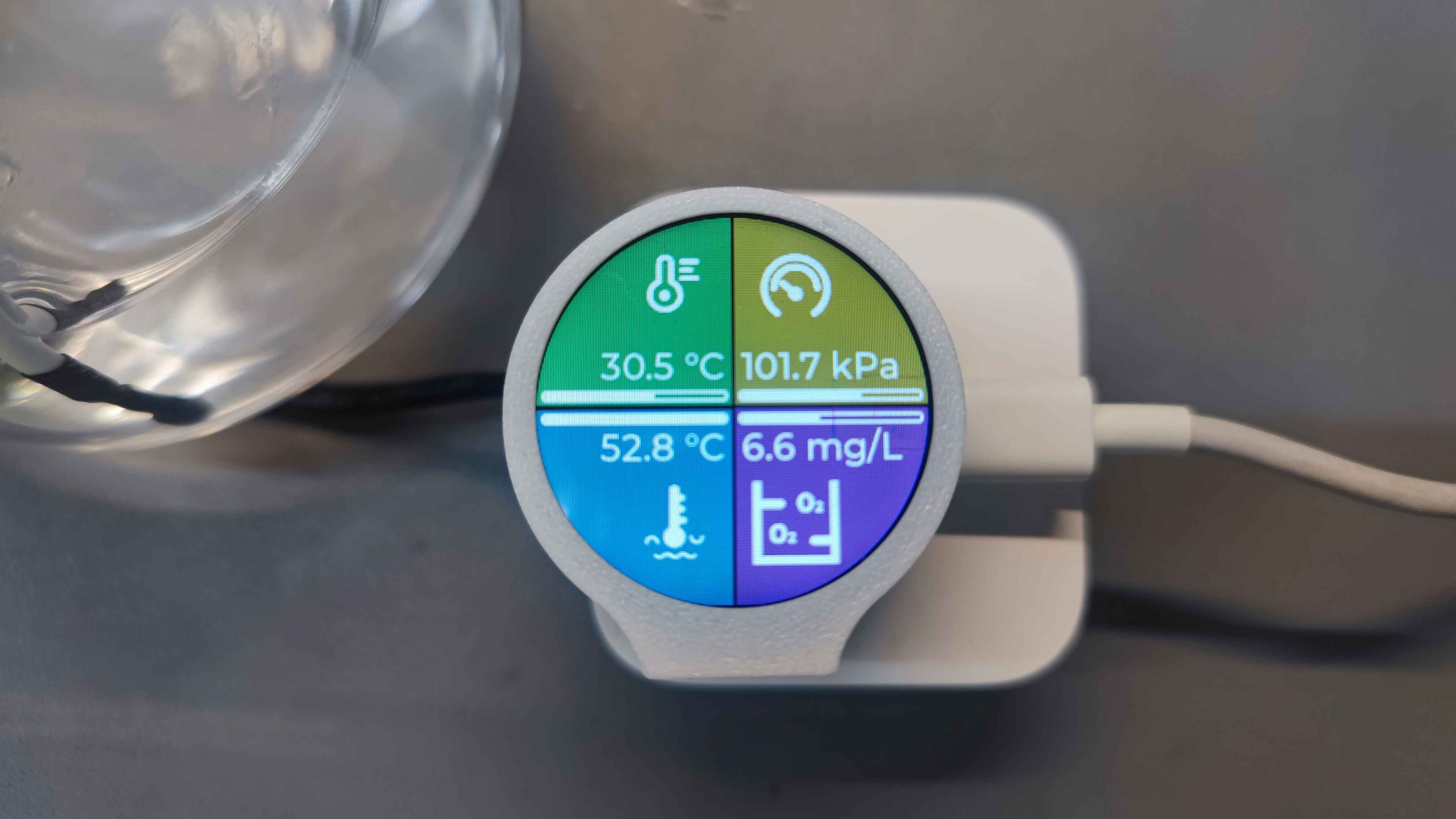 - 组装完成后,将远端测温头放置在空气中进行测量:本地温度30.5℃(因LCD热量传导导致温度较高),远端温度28.8℃,大气压强101.7kPa,计算的溶氧量7.8mg/L。