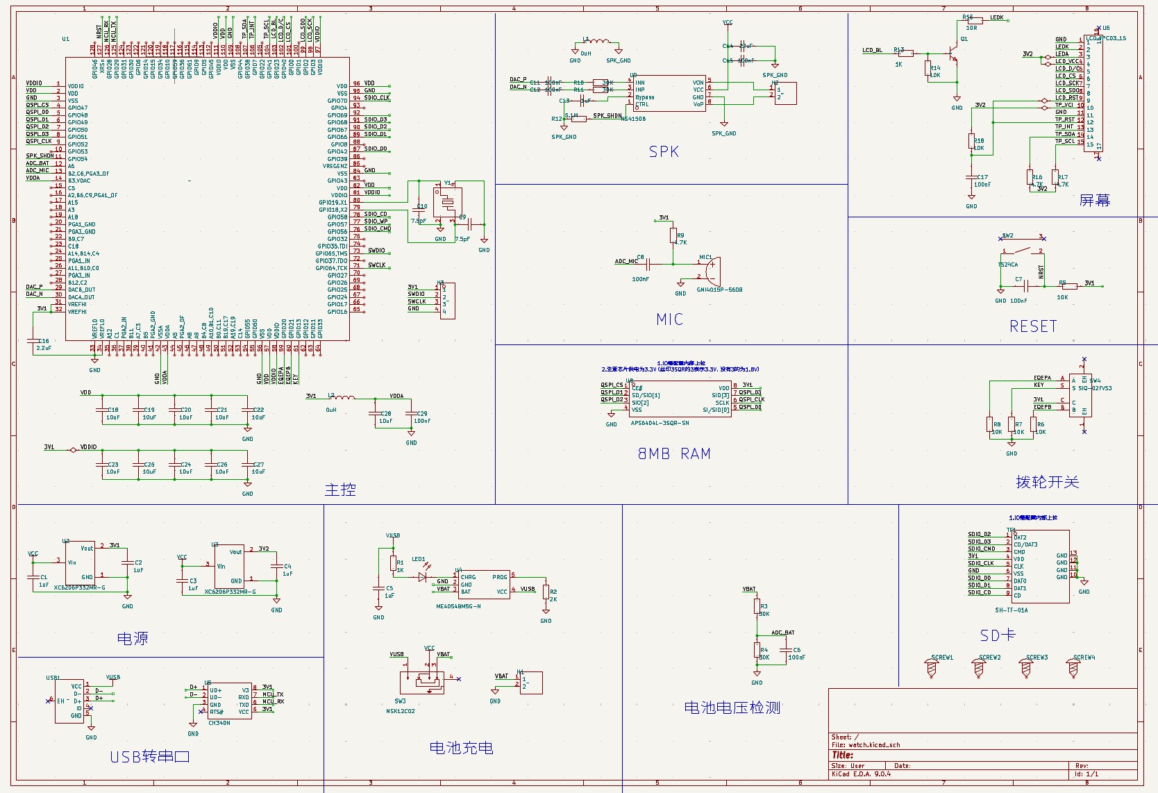 本项目原理图设计如下图所示,需要注意的是PSRAM型号得用APS6404L-3SQR这个带3的,不带3的为1.8V逻辑电平,带3的为3.3V逻辑电平。