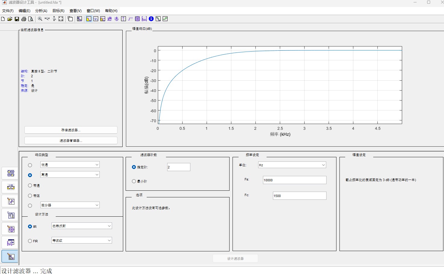 首先采用ADC采集原始音频,由于ADC的局限性,原始的音频数据会有一个比较大的直流分量,直接FFT的话会导致频谱上的0频谱非常高而其他的都很小。所以需要采集到的音频数据先过一个高通滤波器去除直流分量,这里我采用MATLAB设计了一个截止频率1500Hz的高通滤波器得到滤波器参数,再使用芯片内的eMath实现这个IIR滤波器,当采集点数足够时再使用eMath模块进行FFT获得频谱,最后将频谱输送到lvgl进行展示。