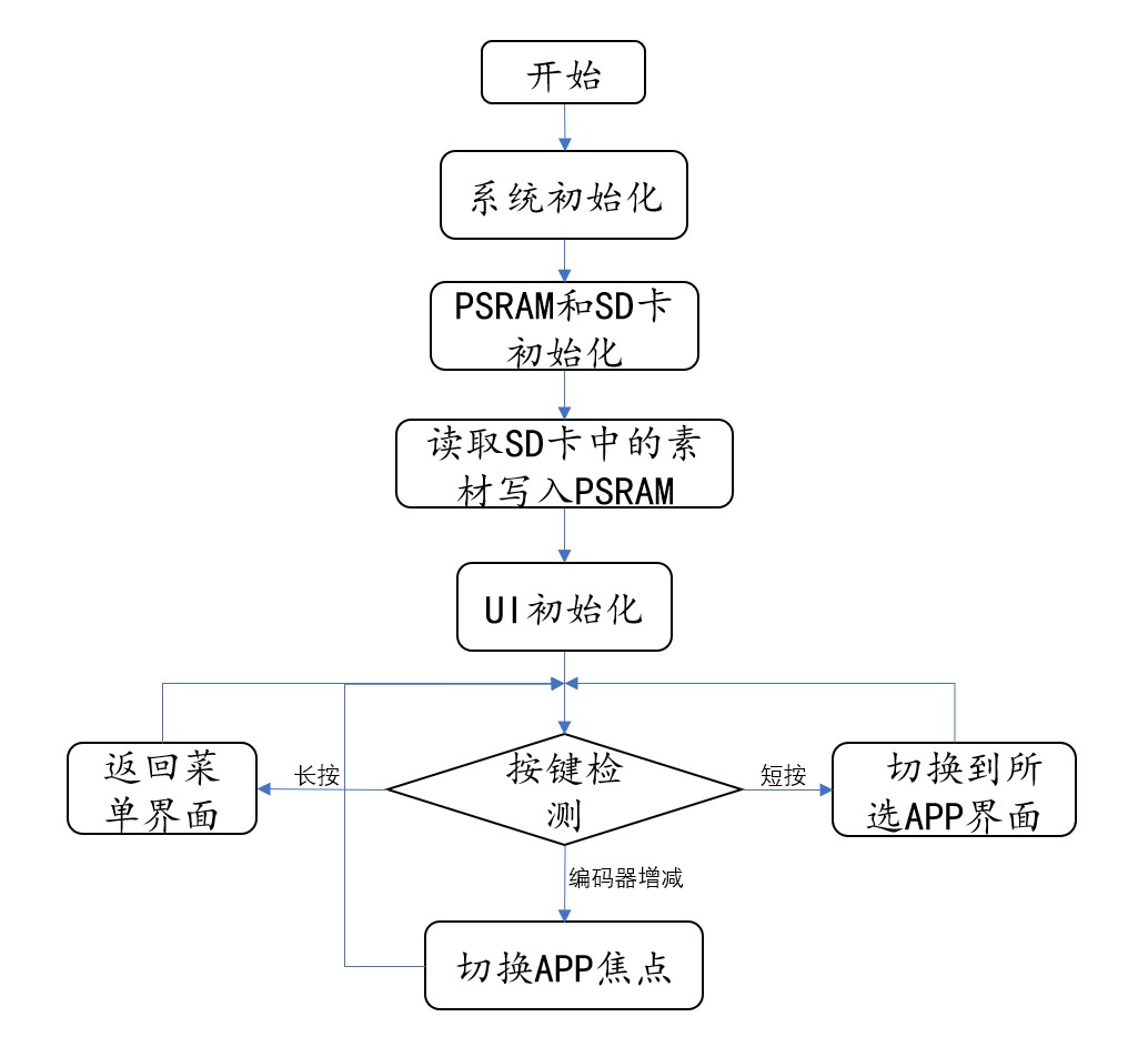 软件流程图如下图所示,主要是在初始化UI之前得先将SD卡中的素材写入到PSRAM中,初始化UI的时候会用到,写入PSRAM的速度很快,时间主要消耗在SD卡素材的读取上。