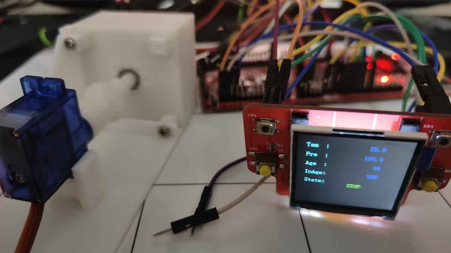 可以看到,整体的系统中,我们包括了主控板,传感器板,相应的测试结构,舵机和咱们的显示板,这些器件一同通过杜邦线连接在一起组成了本次项目的最终效果。咱们在页面显示中,可以看到显示了温度、压力、角度、初始角度和状态等信息,七中通过实现数据的变化进行刷新,不然咱们的界面一直在做刷新动作会影响整个系统的实时运行效果。