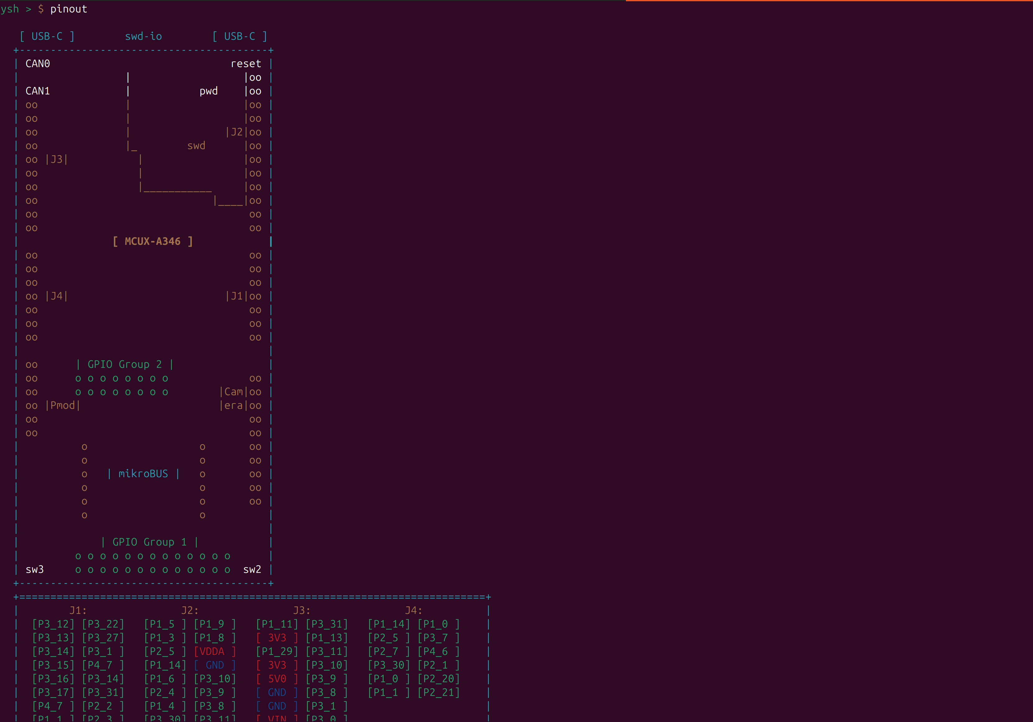使用命令pinout查看开发板橄榄图和j1,j2,j3,j4的引脚内容(参考的树莓派的pinout命令)