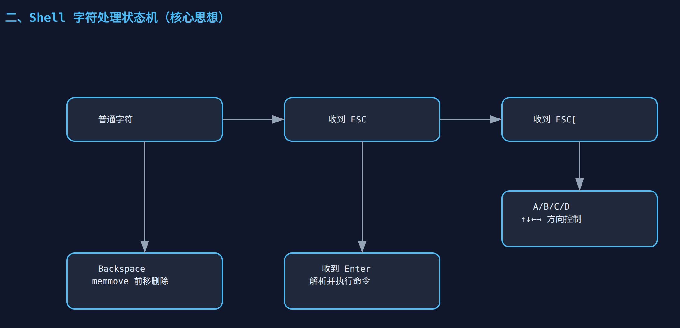 ch == 'D'),内部逻辑不仅把缓冲区的游标g_shellPos减一,还通过发送\b(退格符)让终端上的光标真实地向左退一格。这种软硬件同步的设计非常扎实。