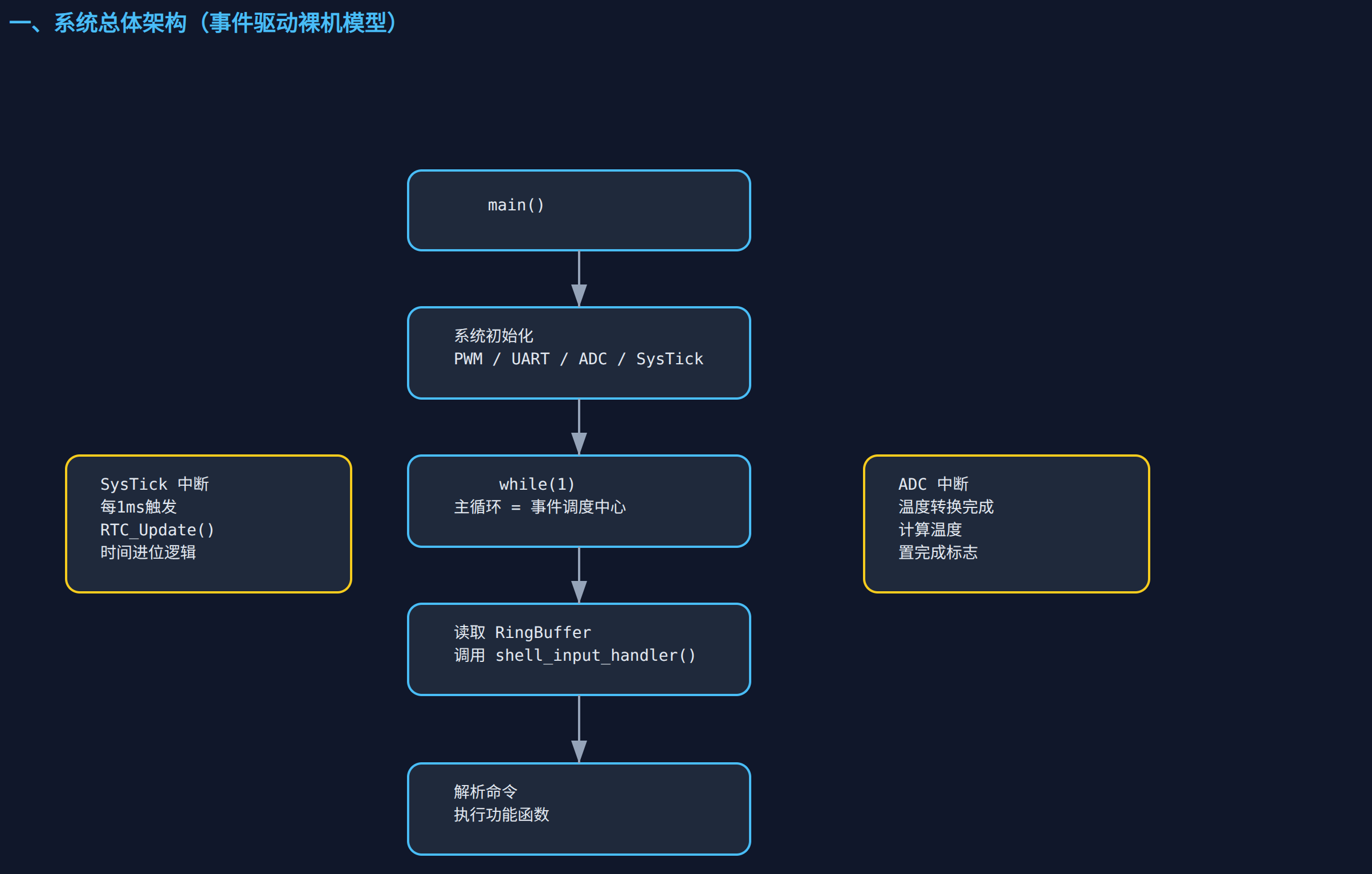 SysTick_Handler中进行计数,满 1000 次后触发一次秒级更新,进而驱动自定义的rtc_time_t结构体(年月日时分秒)进位,为系统提供了独立于主循环的时间基准。