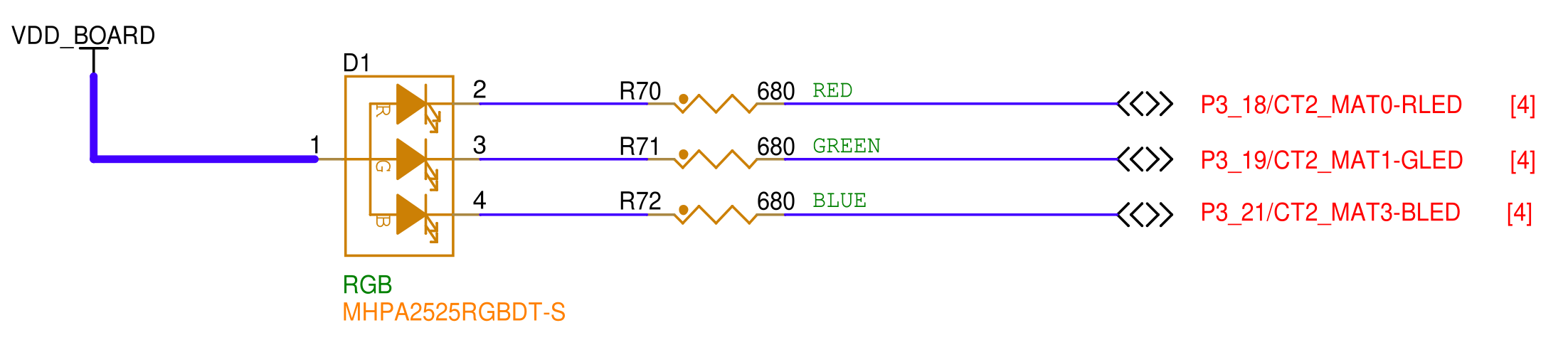 CTIMER_MAT_OUT_RED(Match 0),CTIMER_MAT_OUT_GREEN(Match 1),CTIMER_MAT_OUT_BLUE(Match 3) 三个独立通道,分别映射到板载的 R、G、B 灯上。通过更新各通道的脉冲宽度,实现了 0-255 级的色彩调节。