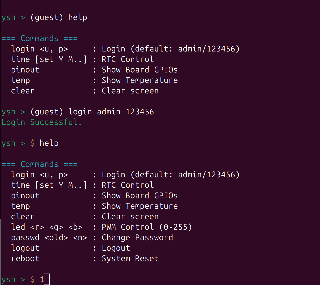 - 最后进入shell,未登陆前为访客模式,无法使用全部命令,比如控制RGB等