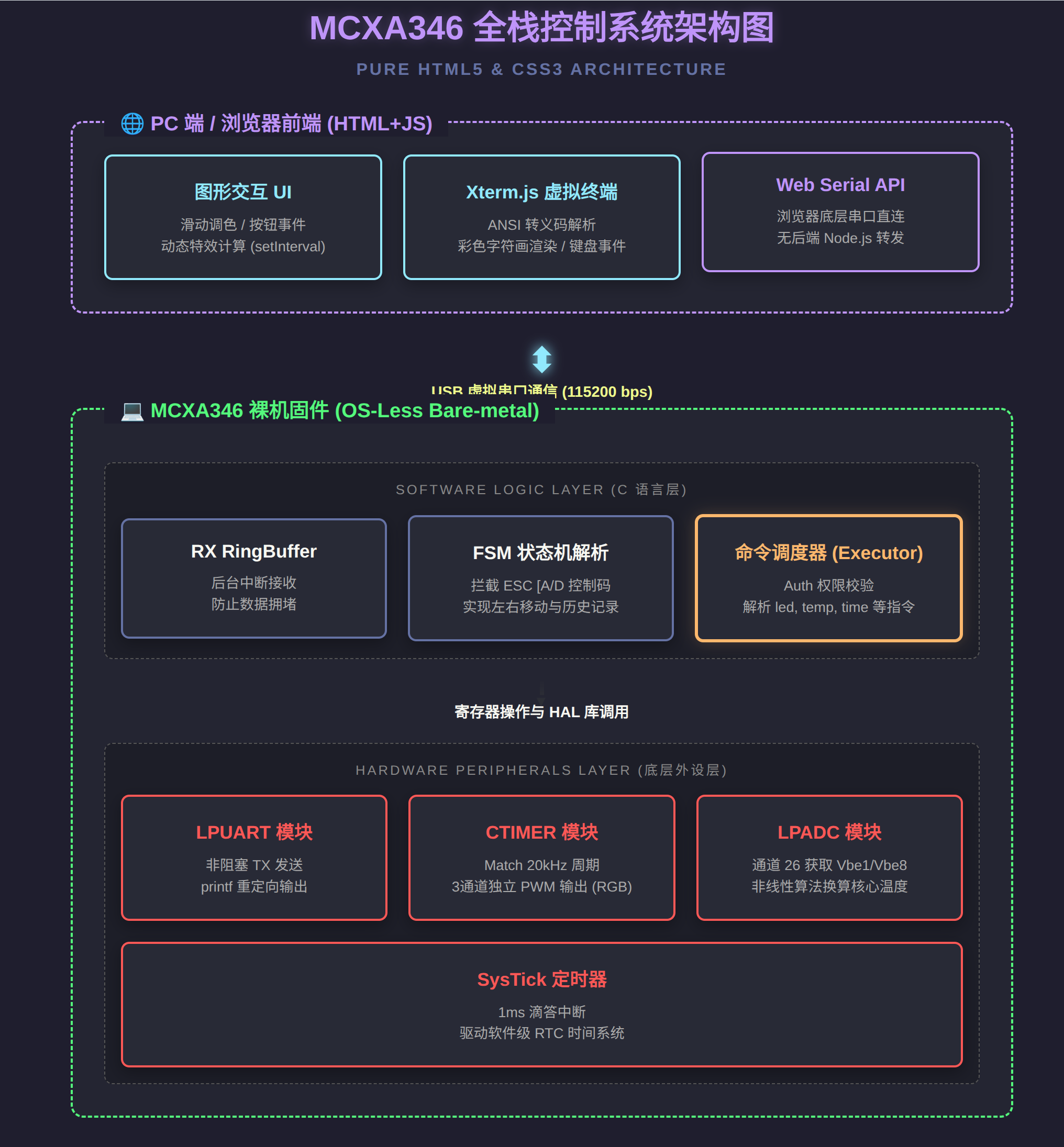 最后,把单片机和纯前端网页(Web Serial API)结合在一起,可以说是这次折腾的“点睛之笔”。以前总觉得硬件就是干巴巴的黑框框代码,现在发现只要思路打开,用最简单的 HTML 和 JS 就能给单片机做个炫酷的上位机,连后端服务器都不用搭。滑块一拖,板子上的 RGB 灯跟着无延迟变色,这种从前端 UI 一路打通到底层硬件的全栈开发体验,真的太奇妙了!