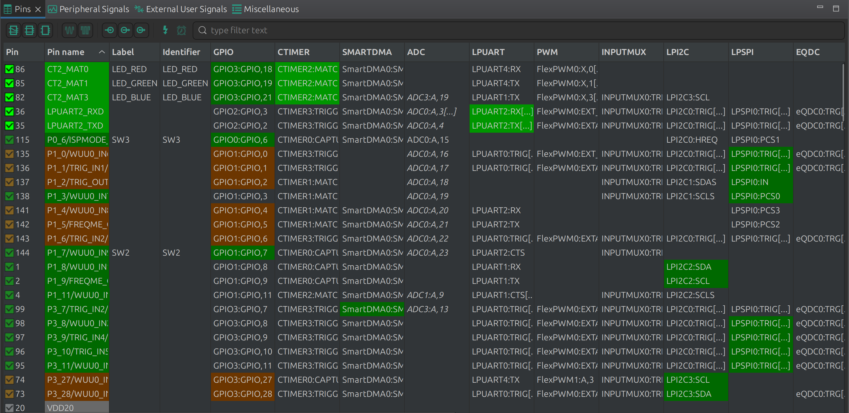 BOARD_InitHardware()(通常包含pin_mux.c),将 UART 信号映射到了 USB-Serial 桥接芯片的引脚上,将 CTIMER 的 PWM 信号映射到了驱动板载 RGB LED 的引脚上。