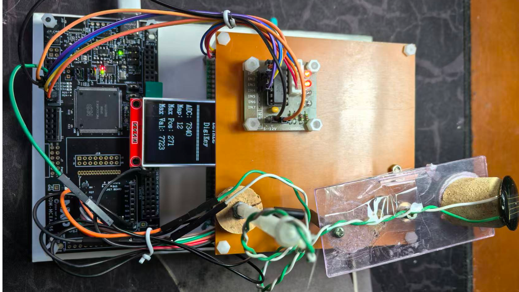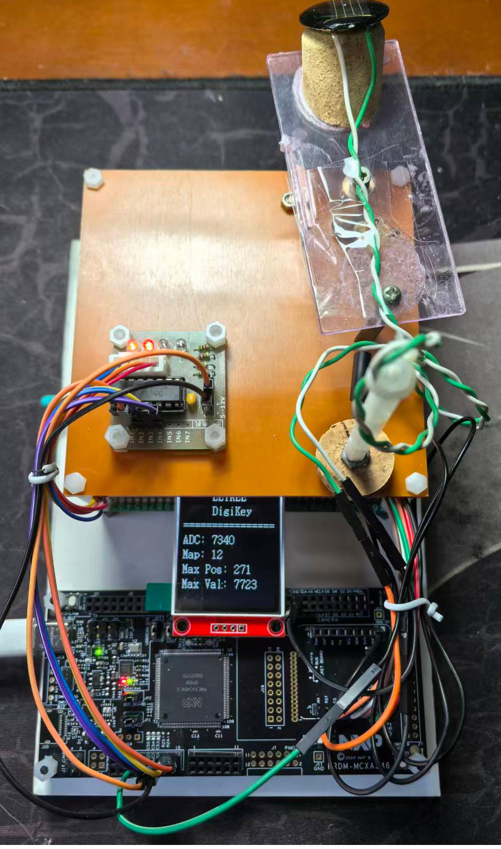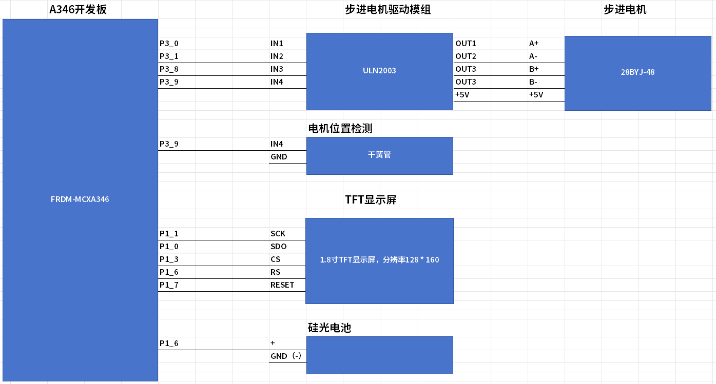 2)连接太阳能电池、步进电机驱动板、TFT显示屏到主控板FRDM-MCXA346上,连接步进电机到步进电机驱动板。