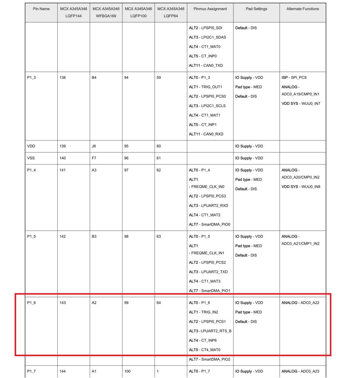 太阳能电池电压的检测处理,用到了MCXA346的ADC功能。本项目中使用J6的AN口,即P1_6口。根据数据手册,P1_6可以用作ADC输入,
