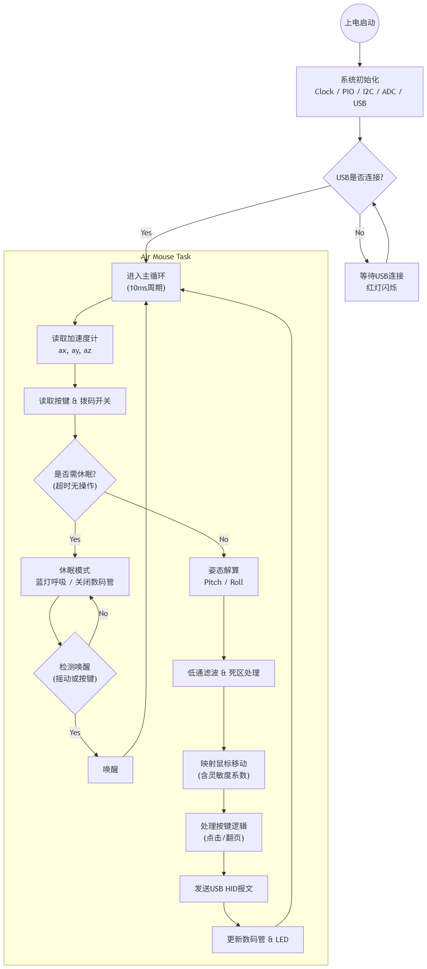 usb_hid_mouse_move(dx, dy)发送 HID 报文。 - Step 6: 根据状态更新 LED 颜色(正常:绿色/热力图;休眠:蓝色呼吸)。