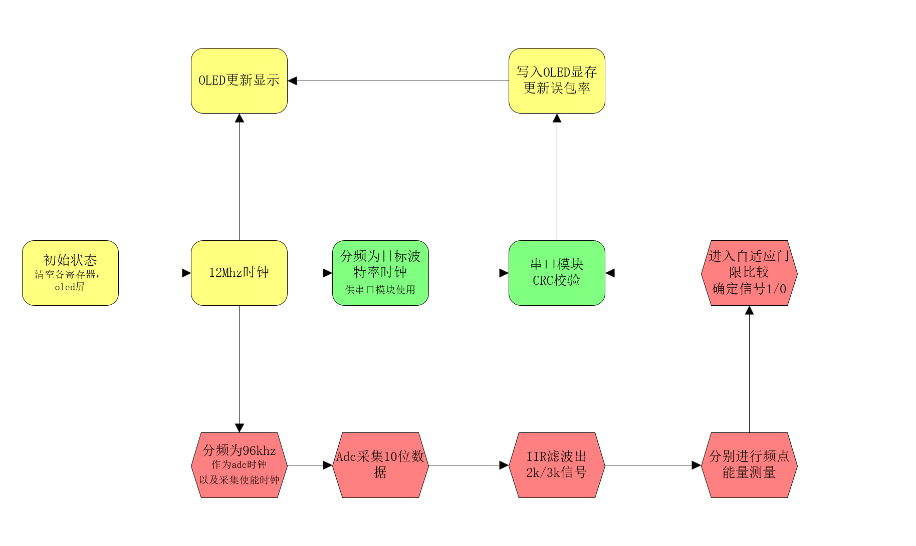 自适应门限:由于空闲时持续1,故不方便写噪声门限(否则1会被视作噪声),故选择仿照施密特触发器,测量1/0能量差绝对值的平均值,保证1/0本身能量大小变化及交界时能自适应调整且避免连续跳变