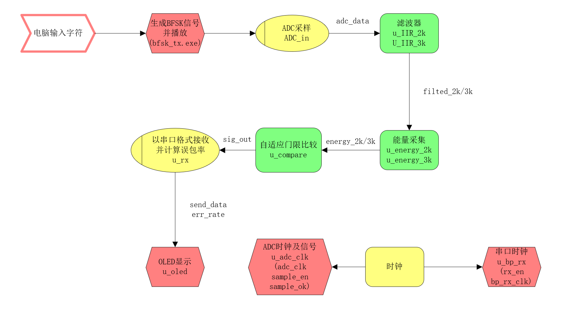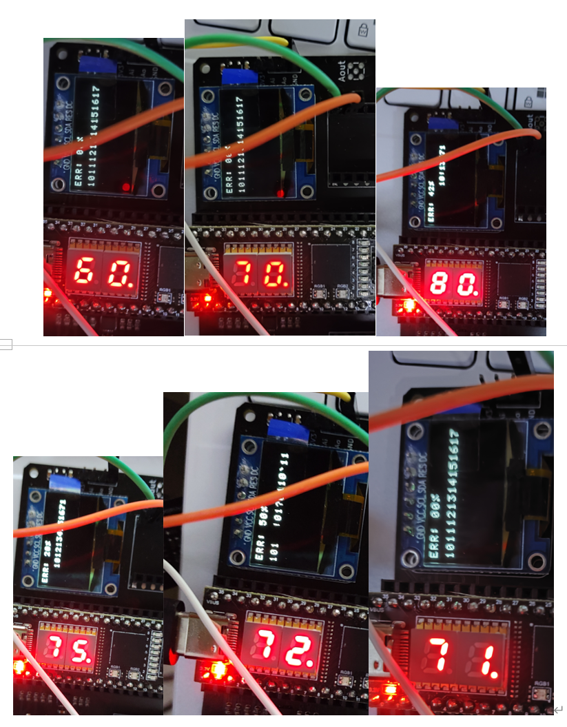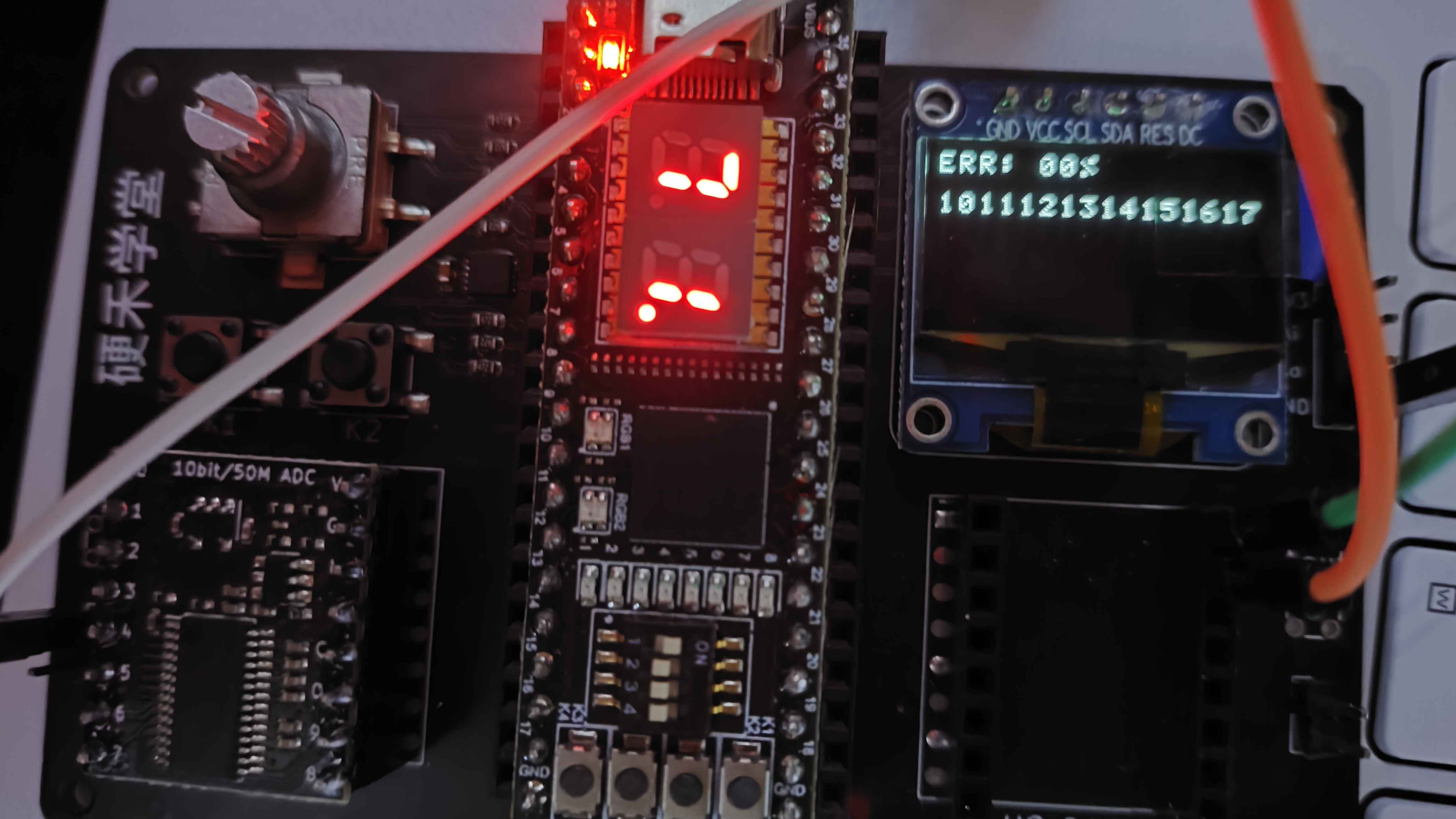 OLED 显示接收的字符或数据包内容与实时误包率;七段数码管显示当前码速。