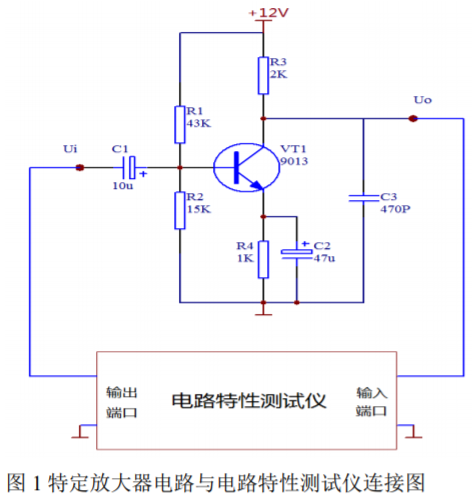 制作图 1 中被测放大器电路,该电路板上的元件按图 1 电路图布局,保留元件引脚,尽量采用可靠的插接方式接入电路,确保每个元件可以容易替换。电路中采用的电阻相对误差的绝对值不超过 5%,电容相对误差的绝对值不超过 20%。晶体管型号为 9013,其 β 在 60~300 之间皆可。电路特性测试仪的输出端口接放大器的输入端 Ui, 电路特性测试仪的输入端口接放大器的输出端 Uo。