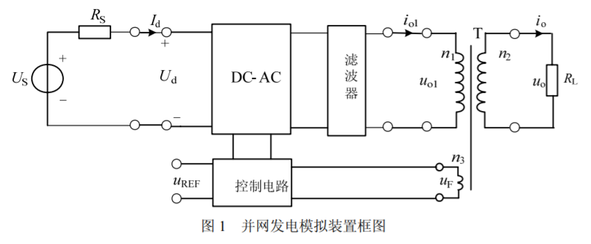 设计并制作一个光伏并网发电模拟装置,其结构框图如图 1 所示。用直流稳压电源US和电阻RS模拟光伏电池,US=60V,RS=30Ω~36Ω;uREF为模拟电网电压的正弦参考信号,其峰峰值为 2V,频率fREF为 45Hz~55Hz;T为工频隔离变压器,变比为n2:n1=2:1、n3:n1=1:10,将uF作为输出电流的反馈信号;负载电阻RL=30Ω~36Ω。
