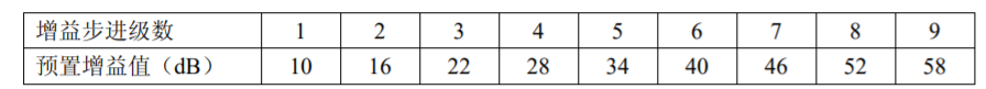 (3)最大增益≥40dB,增益调节范围 10dB~40dB(增益值 6 级可调,步进间隔 6dB,增益预置值与实测值误差的绝对值≤2dB),需显示预置增益值。