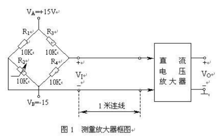 输入信号 VI取自桥式测量电路的输出。当 R1=R2=R3=R4 时,VI=0。R2改变时,产生 VI ¹0 的电压信号。测量电路与放大器之间有 1 米长的连接线。