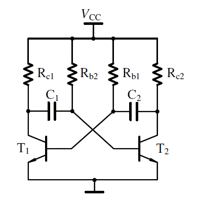 基本的晶体管多谐振荡器如图1所示。电路的特点是晶体管T1、T2通过电容C1、C2 以正反馈的关系互相耦合,由于正反馈和C1、C2充放电的作用而形成振荡,作为开关器件的T1、T2管在振荡时交替地截止和导通。