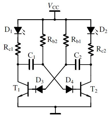 晶体管多谐振荡器实用电路如图2所示。图中在晶体管的基极上接入保护二极管D3、D4,以防止截止管发射结的瞬时击穿,而导致晶体管性能下降以及振荡频率的不稳定。其中Rb选用220kΩ,电容选用4.7μF,Rc的选取根据LED来决定。