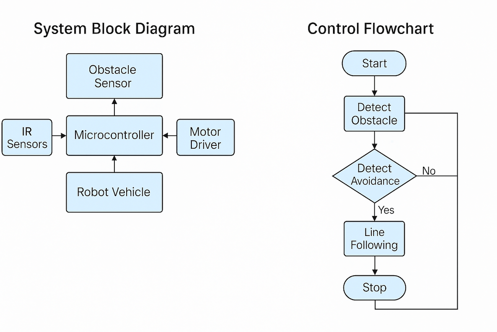 ✅(此处插入“控制流程图”,包含:启动 → 巡线 → 遇障 → 避障 → 判断 → 继续巡线 → 任务完成)