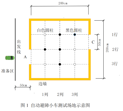 制作一辆自动避障小车,从测试场地边墙入口 A 驶入,按具体任务要求绕过场地内的圆柱障碍,在规定时间内从出口 C 驶出。测试场地如图 1 所示,为边长 2 米的正方形,四周有边墙围挡,两侧有入口 A 和出口 C,4 个白色、5 个黑色圆柱用圆柱座固定在场地上作为障碍物。